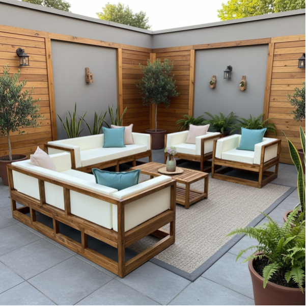 Living de exterior conformado por 5 piezas, 2 sillones de 3 cuerpos, 2 sillones individuales y una mesa de centro